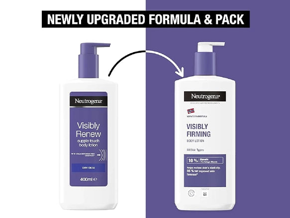 Neutrogena Norwegian Formula Visibly Renew Lotion 400ml is a deeply hydrating, skin-firming body lotion designed to improve elasticity and smoothness. Enriched with pro-collagen minerals and 10% glycerin, it delivers intense moisture for up to 72 hours, helping dry skin feel supple and visibly rejuvenated. The lightweight, non-greasy formula absorbs quickly and is suitable for all skin types, including sensitive skin.